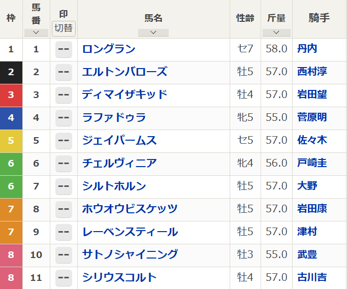 昨年の牝馬三冠で二冠を達成した当馬の秋はここから指導する。昨年の秋華賞以降は結果を残せず苦しんでいたが、前走のしらさぎステークスで2着と復調の兆しを見せた。相手関係など考える部分は多いが、これをきっかけに活躍する可能性は十分にある。今回はC.ルメール騎手から戸崎騎手に替わって出直しの意味も図るので期待も込めて評価した。