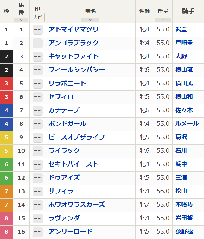 春の同条件のレースである府中牝馬ステークスの勝ち馬なので条件面は全く問題ない。連勝中で勢いがあり、スムーズなら今回も楽しみである。ただ今回はなかなかのメンバーが揃ったので配当妙味は少ないが、軽視するのは危険なので抑えておく。