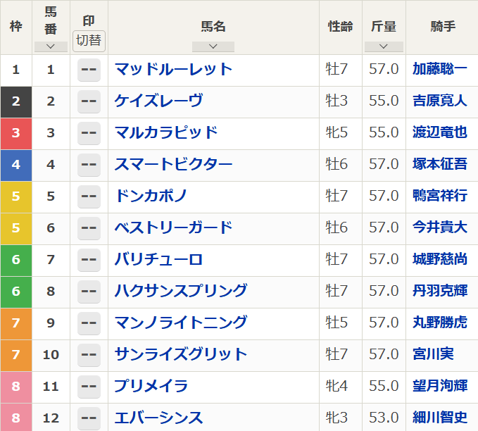地方転向初戦の当馬。中央在籍時には3勝クラスまで進めたがそこから脱出することは出来なかった。能力的にはもちろん中央で走っていたので高いと思うが、転厩初戦で手が出しづらい。ただデビュー時には交流重賞で勝利経験もあるので、いきなり地方の砂に対応出来る可能性はあるので抑えておく。