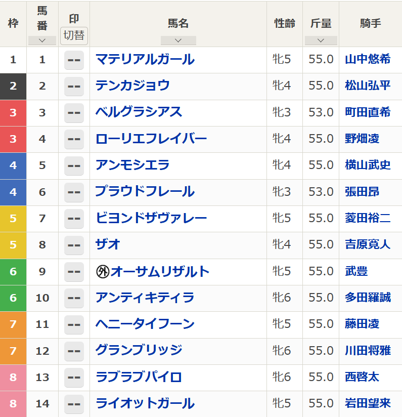 印を打ったなかで唯一の地方馬である。前走は同条件のマリーンカップで中央馬をねじ伏せて勝利しただけにここも楽しみである。斤量面の恩恵はあるが強豪淑女相手にどこまでやれるか、善戦に期待を込めて印を打った。