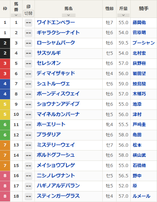 BCターフから帰国してからなかなか自分の競馬が出来ていないが、能力だけで考えればここでも勝負出来る力はある。前走は帰国初戦で状態面が整わないなかでの出走だったみたいで大敗したが、今回はしっかり調整されての参戦なので巻き返しが期待出来る。休み明け初戦でも走るタイプなので、次走に向けて恥ずかしい競馬は出来ない。