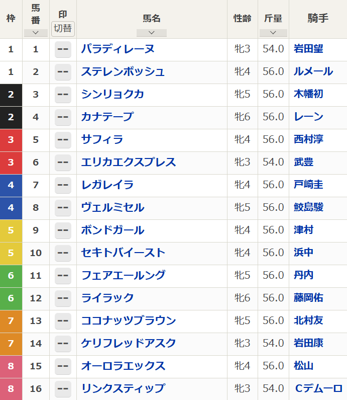 そろそろC.ルメール騎手が勝利するのに飽きたころではないだろうか。彼を買えばだいたい当たるGⅠなんて面白くない。ここはあえて辛口にジャッジしてこの評価にした。昨年の牝馬三冠での安定感で世代トップクラスを証明して、海外でも結果を残してその能力の高さは証明済み。今年は結果を残せていないが、陣営がC.ルメール騎手を手配するということは勝負気配がする。稽古の動きも前走より良かったので状態面が戻っていれば牝馬同士なら上位にいける。