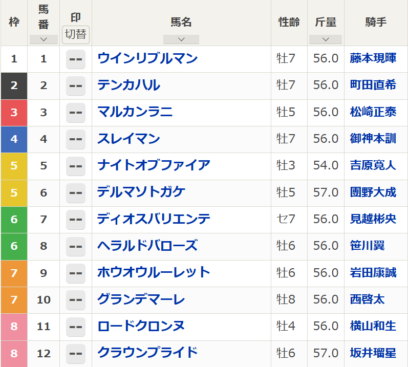国内外で実績があるので実績面だけで考えればメンバー最上位である。能力通りの競馬が出来ればもちろん上位に食い込む力はあるのだが、前走の南部杯9着がネックである。一度リズムを崩すと立て直すのに数戦要するタイプなのである、ただ今回のメンバーなら上位は狙えると判断した。