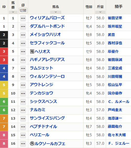 この秋はJRAが全面協力している『ザ・ロイヤルファミリー』が放送されている。JRAが全面協力しているかなのか、競馬の物語なのか知らないがやたらとこの放送がサインになることが多いのだ。このドラマに出演した騎手が勝利したレースもある。残すは北村友騎手と坂井瑠騎手の二名なので注意したい。当日の放送分ではC.ルメール騎手の出演が予告されている。北村友騎手は今回騎乗はないが、坂井瑠騎手とC.ルメール騎手は実力馬に騎乗するので勝ち馬サインと考えたい。