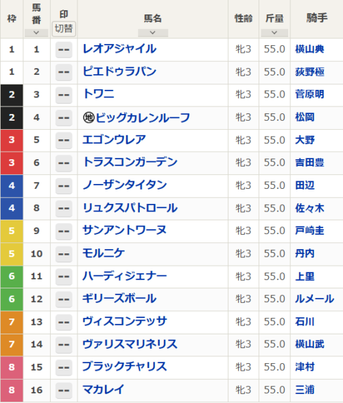 当レースと相性の良いエピファネイア産駒で母父もミスプロ系なので血統面では走る。キャリア2戦で新馬戦では勝利出来なかったので未勝利戦上がりではあるが、同条件下でしっかり修正して勝っていることを考えるとセンスの高さに順応性が高いと言える。枠も良いところに入った。