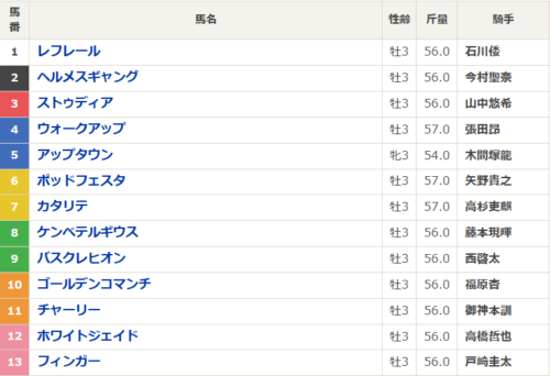 デビューから4戦一度も連対を外したことがない。そして年明けにすでに未勝利戦を使われており勝っているので状態面もかなり良いと判断出来る。前走は圧巻で今までと違い圧倒的な勝利で内容も良かった。能力的には上位ではあるものの休みなくコンスタントに秋から使われているので状態面が心配な面はあるが、力を出し切ることが出来れば勝ち負け出来る。