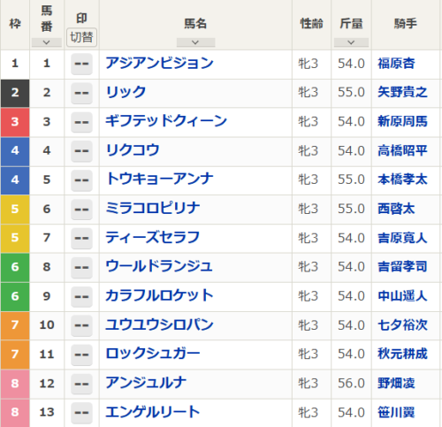 まだ3戦で相手関係もそこまで厳しいメンツと当たっていないので能力値を測るのは難しい。ただ血統やこれまでの3戦の競馬を見ている限りではなかなかの力の持ち主。重賞ではあるがアンジュルナを除けば自分の競馬が出来ればチャンスは十分にあるとみた。
